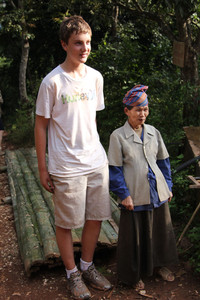 A tall high school boy standing next to an indigenous woman, who is half his height.